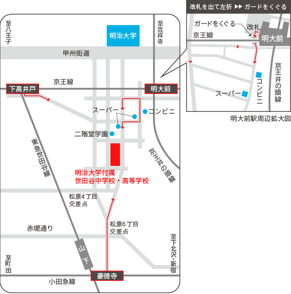• 赤堤通り(「松原六丁目」信号)を横断、その先のY字路を右に、さらにそのまま坂を登り、直進し続けると左手に日本学園正門があります。