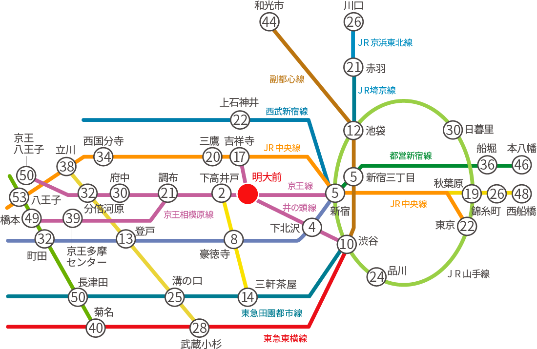 • ○内の数字は、各駅から京王線・井の頭線「明大前」駅までの登校時の乗車時間の目安です。
