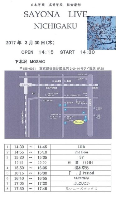 さて、タイトルにもございますように、いよいよ日本学園軽音楽部の卒業ライヴ、〜SAYONA LIVE2017〜が本日開催されます。軽音楽部のこの1年間の集大成のみならず3年生を送り出す催しです。昨日の吹奏楽部の定期演奏会には到底及びませんが、それなりになんとなくみんな頑張っているはずです。そしてそんな昨日の吹奏楽部の定期演奏会、相変わらずマリンバっていい音色だな、と思いました。