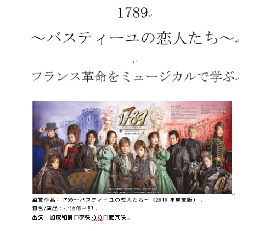 昨日、「フランス革命をミュージカルで学ぶ」と題して、第一部「フランス革命について」(大岩君の説明と質疑) 第二部ミュージカル「1789~バスティーユの恋人たち~」鑑賞会を実施しました。