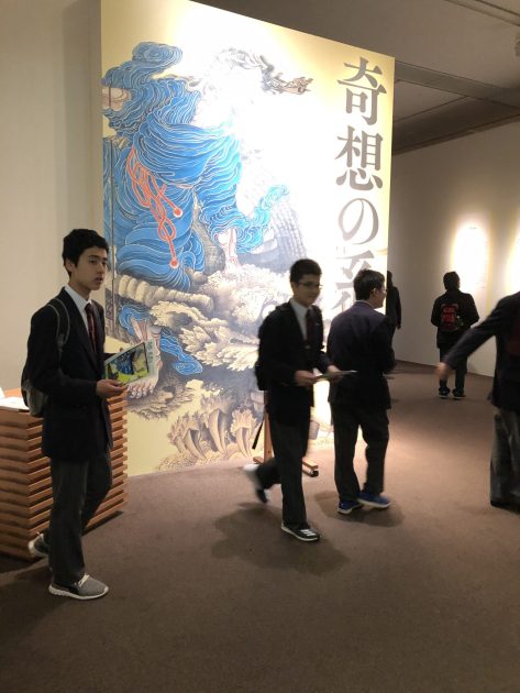 さて、今回の遠征ですが、3か所行きました。参加者は、中2廣岡・佐藤 中3杉田・甘利・中山 高1大竹 高3鎌田と副顧問Jamy先生そして私で、①「奇想の系譜」(東京都美術館)②「ル・コルビュジェ」(国立西洋美術館)③「国津神」天明屋尚(てんみょうや ひさし)(ミヅマアートギャラリー)という3か所。
