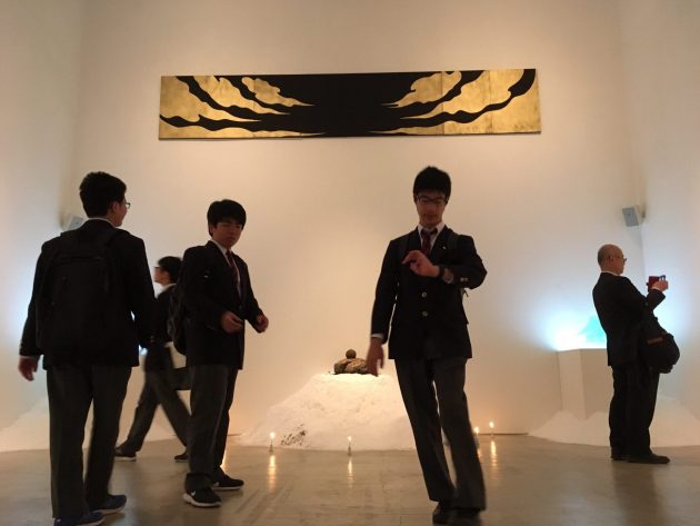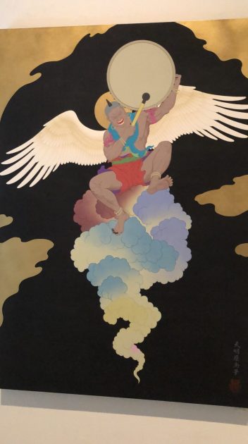 ギャラリーには、絵画の下に大量の塩が盛ってあり、伊勢神宮の社を思わせる模型が二か所あって、中央上方には10点の画の背景にもなっている雲の画が横長の画布に描かれて掲げられていました。空間の演出も楽しく、国津神の表情もユーモアがあり、たいていは単独で描かれることなく、神獣(麒麟や龍など)にまたがっている構図で描かれていました。生徒たちは、その絵はもちろんですが、空間を楽しんでいました。ギャラリーの方、お世話になりました。天明屋さんは今後もっと活躍される画家だと思いました。