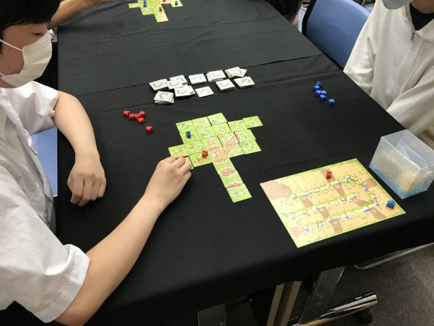 ↑こちらは初心者向けテーブルでカルカソンヌをプレイ中。中大杉並高校の生徒がインスト(=説明)をしてくれました。盤面は序盤でこれからといったところ。