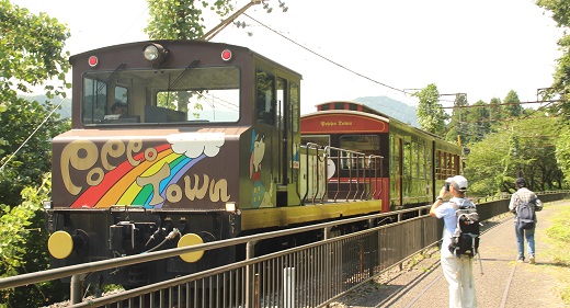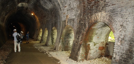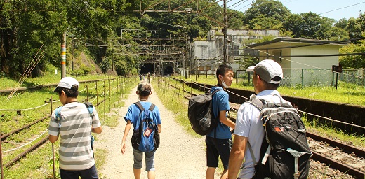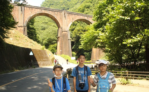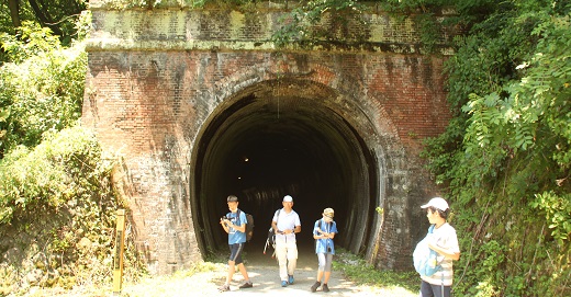部員たちは、蒸気機関車の煤煙対策の排気口のついたトンネル、耐震補強を加えたレンガ作りのめがね橋、丸山信号所跡、トロッコ列車などを眺めながらアプトの道を歩きました。