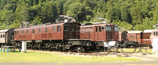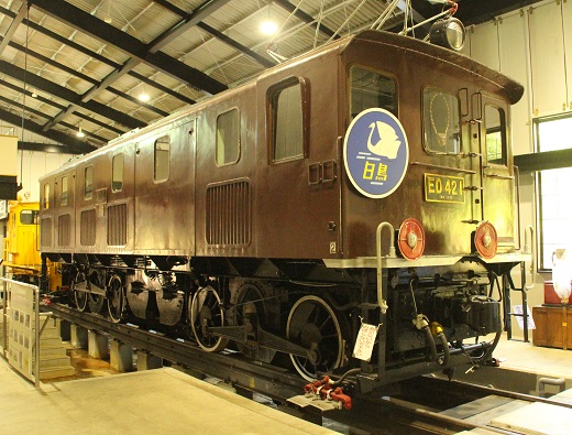 かつてアプト区間を走っていたED42形電気機関車も展示されています。ED42形は、鉄道省(後の運輸通信省)が設計・開発したラックレールを使用するアプト式直流用電気機関車です。横川-軽井沢間(碓氷峠)用の電気機関車で、EC40の置換え用として設計・開発されました。1961年にはキハ57系による急行「志賀」「丸池」、キハ82系による特急「白鳥」が運転を開始したが、これら気動車でも横川-軽井沢間では自力走行が出来なかったので本形式の電気機関車による推進・牽引が実施されました。1963年、横川-軽井沢間が全面的に粘着運転による新線へ切り替えられ、ラック式区間が廃止されたので、本形式は全機が廃車されました。