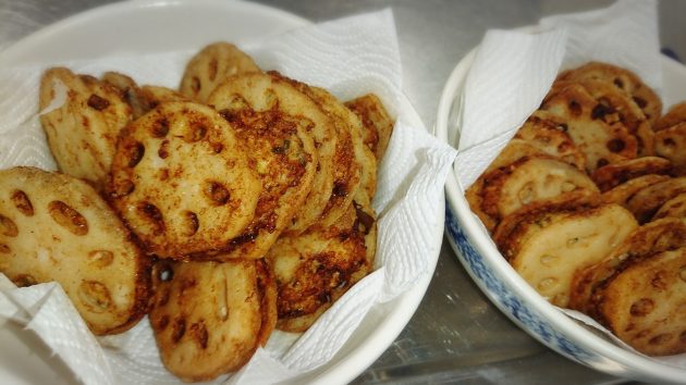 蓮根に味付けした挽肉を挟んで、片栗粉をたっぷり☆