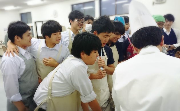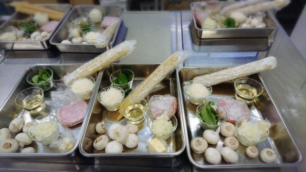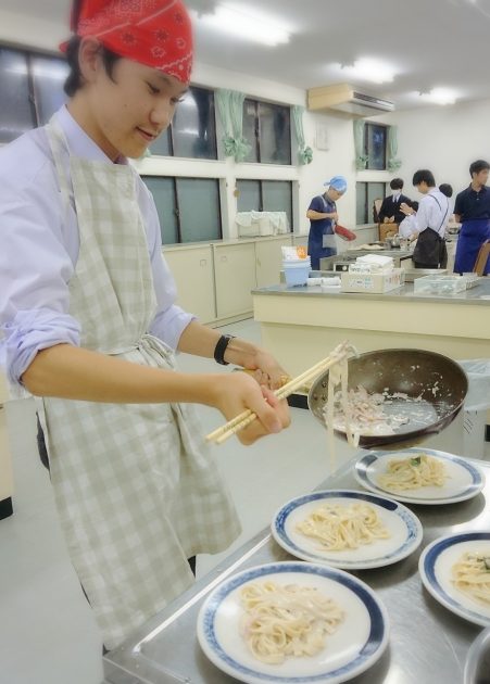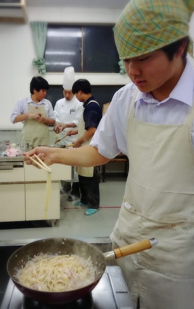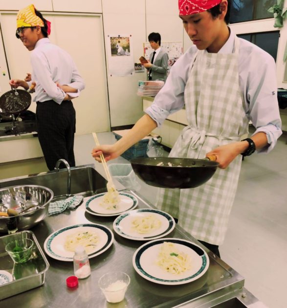 はじめに全工程を一気に見せて頂きます。手早さが勝負のクリームパスタ、みんな必死に見て聞いて覚えます。