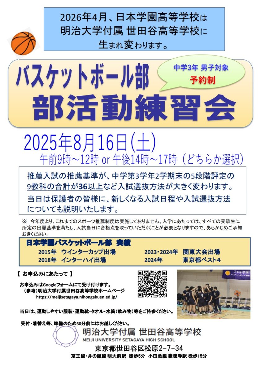 バスケットボール部は、中学3年生男子を対象に、下記のように練習会を実施します。