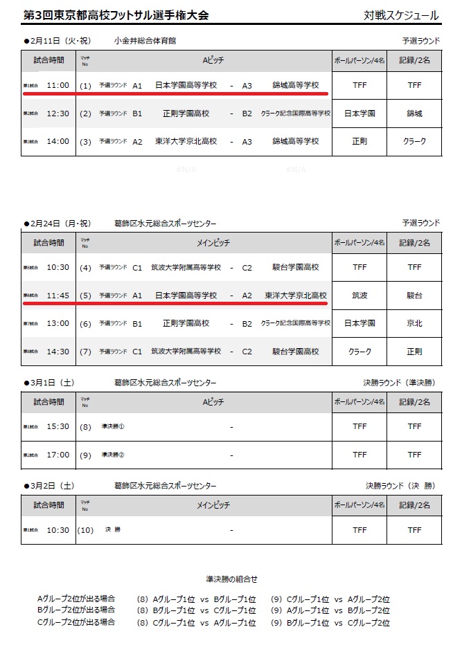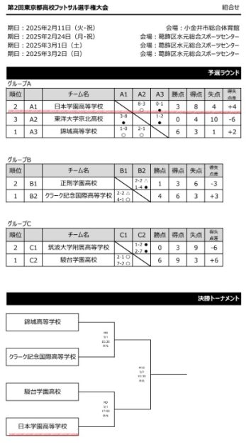 第3回東京都高校フットサル選手権大会 予選R結果、準決勝進出 結果