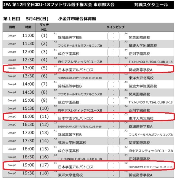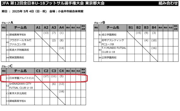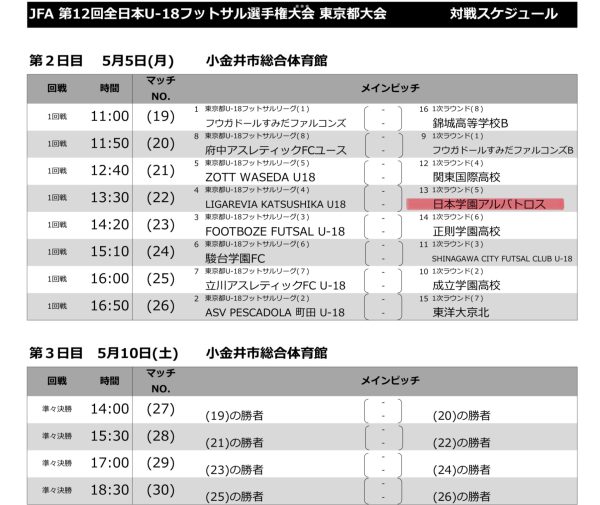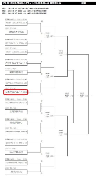 JFA 第12回全日本U-18 フットサル選手権大会 東京都大会 決勝トーナメントQF結果