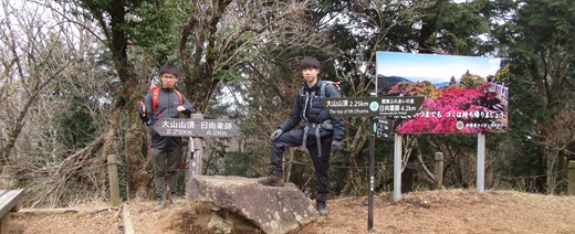 伊勢原駅―(神奈中バス)―大山ケーブルバス停…(コマ参道20分)…大山ケーブル駅…(女坂15分)…大山寺…(女坂15分)…阿夫利神社下社…(50分)…富士見台…(5分)…ヤビツ分岐…(10分)…大山(1251m)・阿夫利神社本社…(41分)…見晴台…(18分)…二重の滝…(男坂20分)…大山ケーブル駅…(コマ参道)…昼食…(コマ参道)…大山ケーブルバス停―(神奈中バス)―伊勢原駅・解散