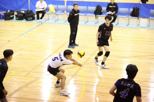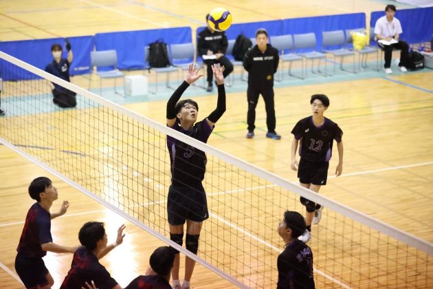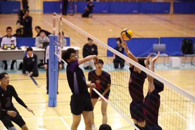 1試合目は準決勝で駒大高校と対戦した。相手は安定した強さを兼ね備えており、どこまで本校のバレーで相手を崩せるかがポイントであった。結果的にはフルセットの末惜しくも敗戦してしまったが、特に1セット目の中盤以降の本校の勢いは、今まで取り組んできた成果が存分に発揮され、相手を寄せ付けない勢いを感じさせる場面もあった。